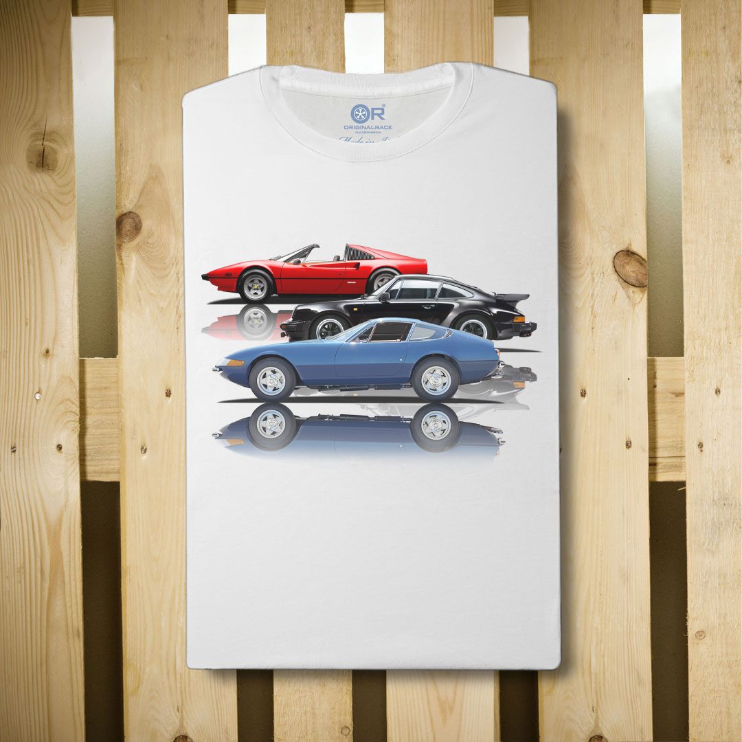 An item of clothing reserved for fans of engines that have made history. Wearing them is an act of love that can be understood by those who get excited when they open the bonnet of a car and are flooded by the mix of smells of petrol and burnt oil, the soul of mechanics. For these people OriginalRace was born, a premium line produced in San Marino where every single model is made from the photographs of cars actually owned by us or by our loyal customers. Top quality short-sleeved T-shirts. The graphics are made in a mixed technique between illustration and photography, making each OR garment a unique work of art. All our prints are made using a manual process, small differences between the T-shirts are considered a feature of exclusivity of the product.