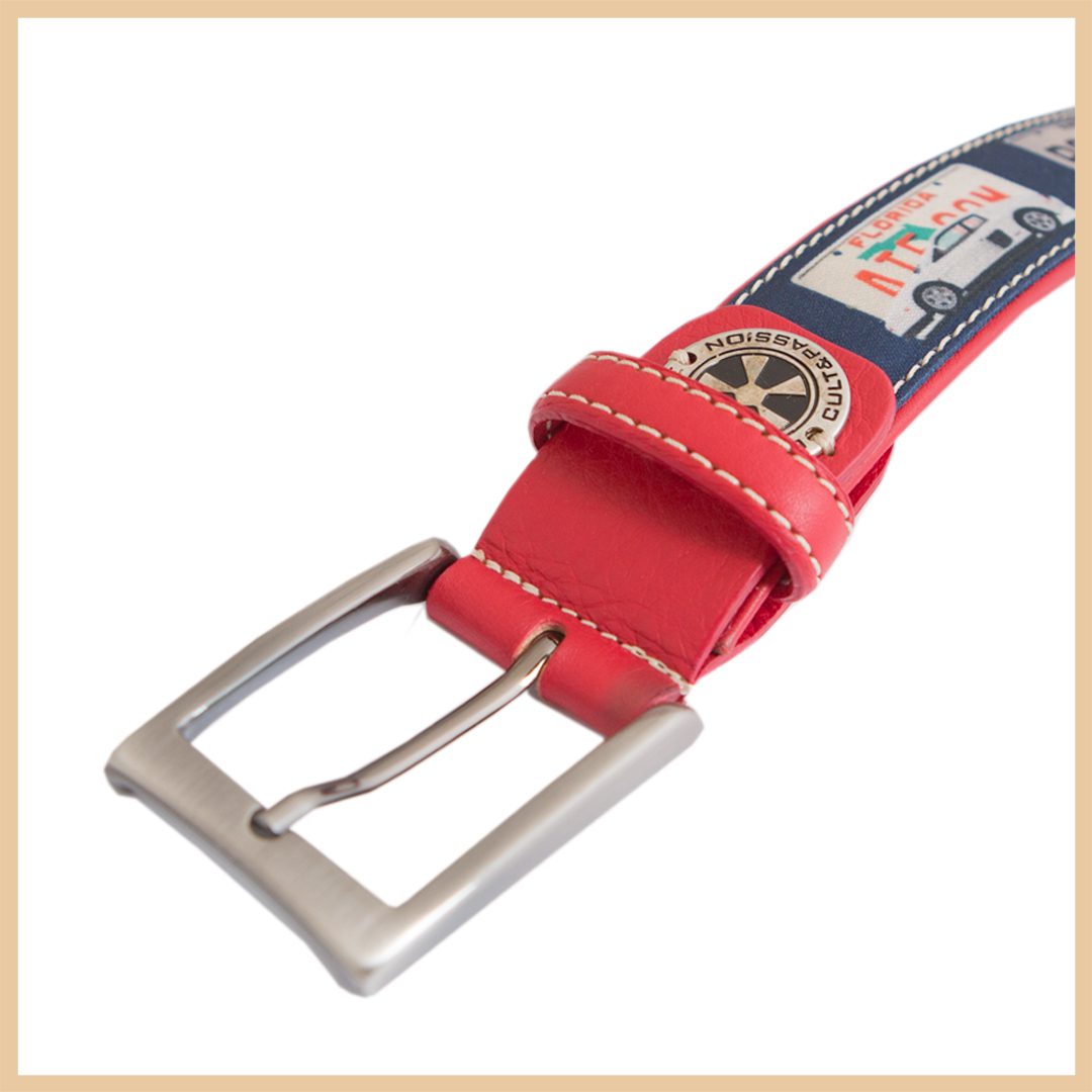 Ceinture unisexe en cuir véritable combiné à un tissu imprimé durable, fabrication artisanale de haute qualité, Made in Italy.