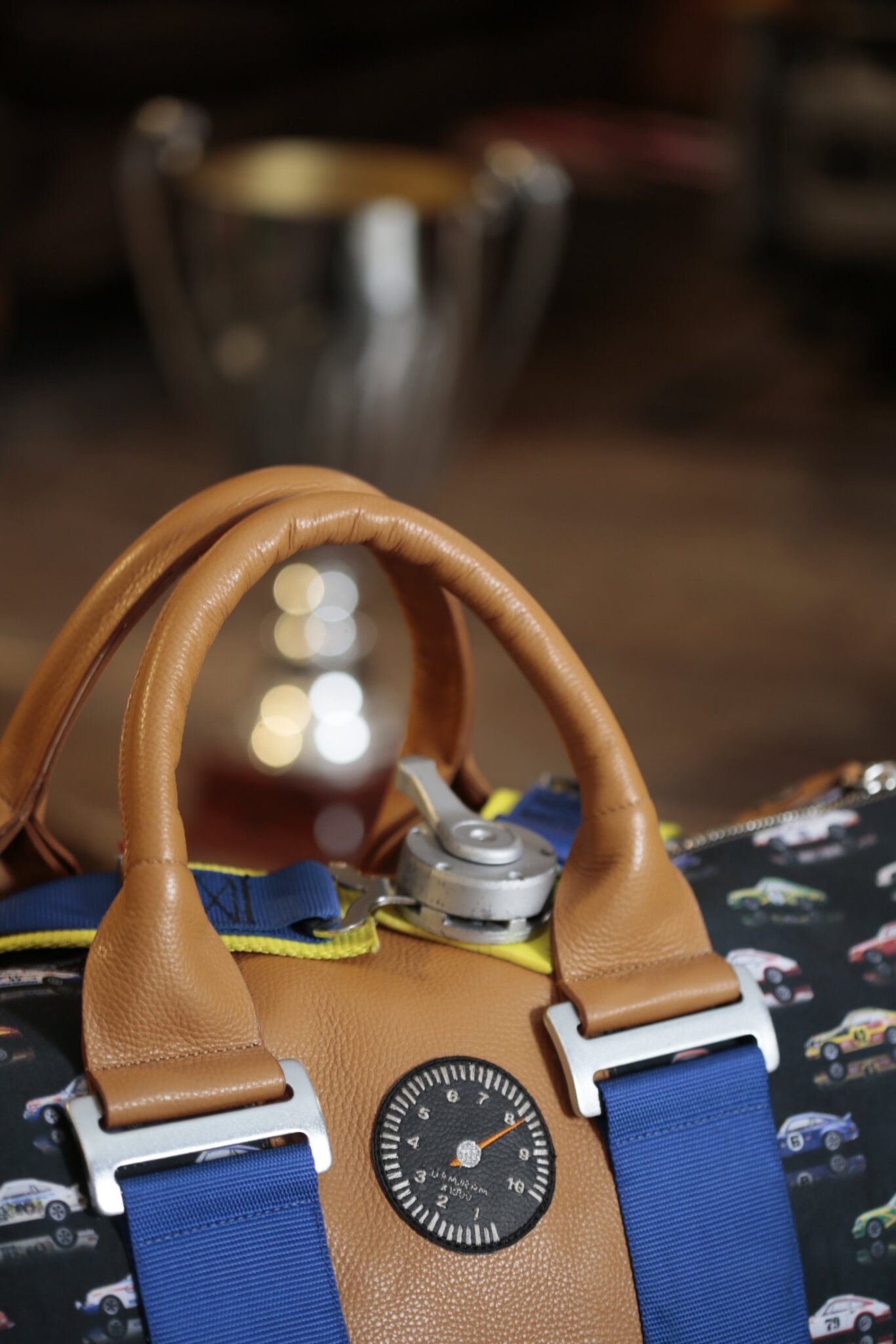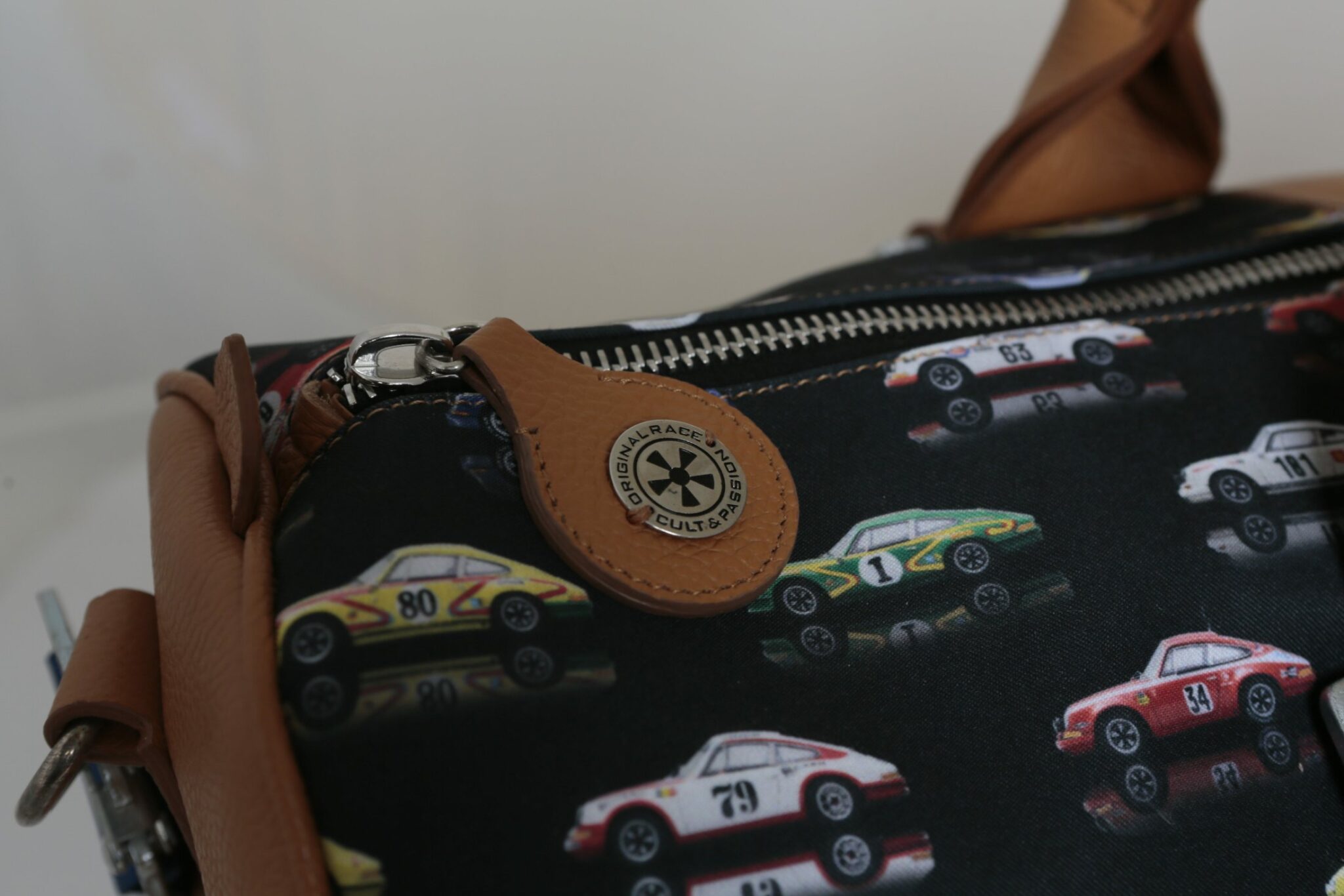 I materiali utilizzati sono di alta qualitร : pelle di vacchetta martellata di colore beige, abbinata al tessuto resistente stampato con le Porsche ST 2.3 e 2.5 degli anni โ70.